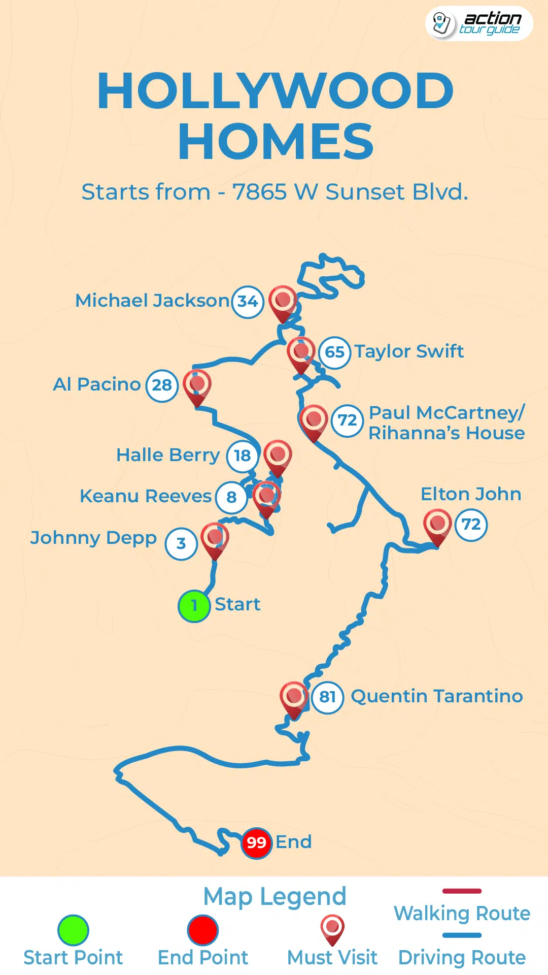 Drive by all of your favorite Celebrity Homes and hear about their famous occupants! From Sunset Strip to Bel Air, check out celeb homes in high-end Rodeo Drive, luxurious Beverly Hills, and star-studded Hollywood Hills. From the classic stars of yesterday to the mega-stars of today, this self-guided audio tour will talk about all of your favorite celebrities. End with a visit to the famous Hollywood Sign! Hear entertaining & exciting celebrity stories as you drive through legendary neighborhoods.
