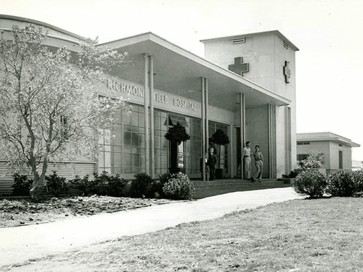 To the right, on the corner of Cutting Boulevard and Marina Way South, is the Richmond Kaiser Field Hospital. The ghostly outline of a red cross on the central tower hints at the building’s former use, which dates as far back as August of 1942 when it was built with funds from the United States Maritime Commission and leased by the Kaiser Permanente Foundation as treatment facility for the one of nation’s earliest and largest prepaid medical plans. The hospital you see formed the foundation of the Kaiser Permanente health plan, which now numbers 12.6 million members nationwide. The hospital was built in a time of enormous growth for the City of Richmond. Between 1940 and 1943, Richmond’s population had increased more than five-fold, from 23,642 to 130,000 residents, many who worked at the Kaiser shipyards. By the middle of 1941, it had become apparent that such explosive growth was severely straining the limited treatment facilities in Richmond. By one count, only twenty-nine local doctors were available to assist the estimated 62,000 workers at Kaiser. This situation was exacerbated by the fact that several local hospitals would not admit or treat non-white patients, even though an estimated 20,000 African Americans worked in the Kaiser shipyards. The Kaiser Field Hospital, however, treated all patients, regardless of skin color, as noted in a San Francisco News article of October 7, 1943: “Illness knows no color lines here. Red-helmeted men, women welders, [and Black workers] lined up for a checkup by the busy young doctors.” The Richmond Field Hospital remained open after the war. In the late 1970s, Kaiser built its existing hospital facility downtown. By 1995, the Field Hospital finally closed its doors and the building was purchased by The Islamic Community of Northern California in 1999.