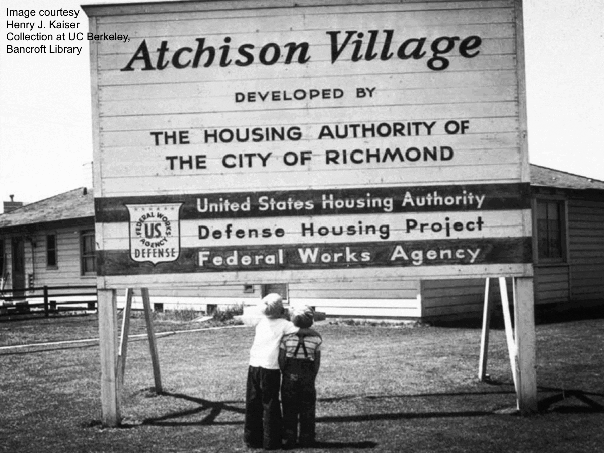 You should now be facing the National Register of Historic Places District of Atchison Village. Atchison is the first of scores of federally funded wartime housing projects in Richmond. Designed by architects Carl Warnecke and Andrew Hass in 1941, Atchison Village found its inspiration in the earlier “garden city” and “city beautiful” movements. There are 450 units in 162 buildings here, ranging in modest size from 540 square feet to 857 square feet. Richmond’s housing landscape has always been marked by boundaries. Between 1900 and 1925, local real estate developers, anticipating substantial growth in Richmond attempted to profit from demand by subdividing large parcels into extremely small lots for the time (25' x 100'). Since then, Richmond’s housing has been in short supply, hemmed in by industrial facilities and transportation corridors. This, along with racial housing covenants made the city even more prone to racial segregation. Quality, spacious housing, as is found here in Atchison Village, was only made available to White shipyard workers. Hastily built housing to the south of here near the shipyards was reserved for Black shipyard workers. Prior to the federal housing projects, the city struggled with providing housing. In fact, in the 1920s, the Santa Fe railroad hired Native Americans from the Laguna and Acoma Pueblo tribes to work at the RIchmond railyards immediately to the Northeast of Atchison Village. The Laguna and Pueblo were forced to live in boxcars turned into living quarters, and as the community grew, it became known as “Boxcar Village.” Boxcar Village was completely demolished by the early 80s, when the Santa Fe Railroad chose to cut the power to the village. Richmond’s population had increased by five-fold in a few short years, so people lived in whatever they could find - tents, cardboard shacks, greenhouses, barns, garages, automobiles. For those workers who were lucky to find housing, many shared their sleeping quarters as "hot beds" in which shipyard workers took turns sleeping in shifts.