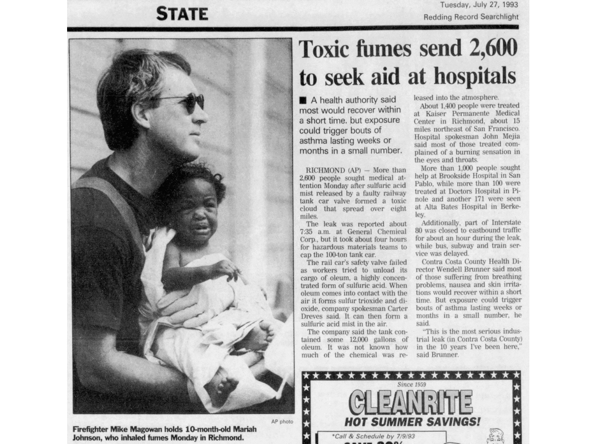 From its earliest days, the City of Richmond touted its success and built a future based on an industrial foundation. Railroads, refineries, and factories characterized the City’s early development and influenced its post-war development. As with any development trajectory, there comes with it consequences – and opportunities. At 7:15 in the morning of Monday, July 26, 1993, a safety valve on a railroad tanker car storing sulphuric acid at the General Chemical Corporation yard at 525 Castro Street failed. A cloud of toxic sulfuric acid poured out and began drifting northeast towards North Richmond, San Pablo, El Sobrante, Pinole and points east. Over four hours, the poisonous plume spread seventeen miles to the Delta and 3,200 people flooded local hospitals in Richmond, San Pablo, and Pinole suffering from nausea, headaches, burning eyes and throats. In the years before the disaster, local government oversight agencies routinely fined General Chemical for failures to adhere to safety rules and regulations. In the wake of the disaster, the community began to organize to protect their rights and reduce toxic dangers to their neighborhoods. Within a year, the State Legislature and County passed laws regulating the storage of toxic chemicals in railroad tanker cars and later regulations to monitor for and reduce refinery flaring. Alongside post-disaster regulatory changes a larger social movement emerged to identify the causes of and prevent disasters. Led by ministers, civil rights and social activists, and community organizers, researchers began to fight for environmental justice. An examination of the General Chemical spill and similar disasters by these groups uncovered a common pattern – a close coexistence of heavy industry and poor and minority-majority communities correlating with higher incidences of chronic illness, inflammation, cancer, and overall poor health. Facing few options to relocate to cleaner, healthier areas, residents resisted the presence of pollutants, carcinogens, and toxic materials that have affected and continue to affect the health of area residents. Individuals like North Richmond native Doctor Henry Clark and the West County Toxics Coalition “have helped pioneer an environmental justice movement that has fundamentally changed the conversation in Richmond.” The push to clean up Richmond’s industrial areas, West County Toxics and other organizations pushing for environmental justice continue to fight to compel industries to disclose the dangers, be a good neighbor, and clean up their operations.