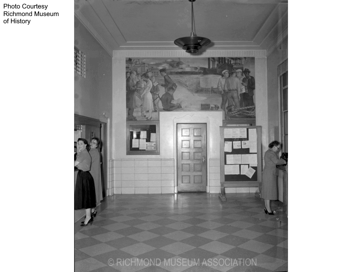 Before turning left towards MacDonald Avenue, you’ll see a New Deal-era Post Office. It was at this Post Office that an art treasure was rediscovered and saved: a 1940s mural commissioned by the U.S. Treasury’s Section of Fine Arts. The mural, “Richmond Industrial City,” by Victor Arnautoff, had adorned the wall in the post office’s lobby until 1976 when plans for a renovation necessitated its removal. Packed carefully and stored in the basement, the crate had been long forgotten until 2015 when Melinda McCrary from the Richmond Museum of History reached out to a post office maintenance worker to hunt it down. Ultimately turned over to the Museum, the mural was in need of repair, and funds were raised to restore the piece, which was then sent to the Fine Art Conservation Laboratory near Santa Barbara, California, where the delicate restoration process took place under the watchful eye of Conservation Specialist, Scott Haskins. The mural’s artist Victor Arnautoff, a native of Ukraine (then under the Soviet Union), was commissioned to produce murals for several buildings in San Francisco as part of a New Deal era program. Arnautoff, a former student of Mexican Post-Impressionism muralist Diego Rivera, traveled to Richmond to get a feel for the city and its people before starting his project. The final mural depiction is that of Richmond townsfolk and Standard Oil workers set against a backdrop of the refinery and hillside tanks. Restored and shipped back to Richmond, the mural is now permanently housed at the Richmond Museum of History thanks to the valiant efforts of Melinda McCrary and the conservation team.