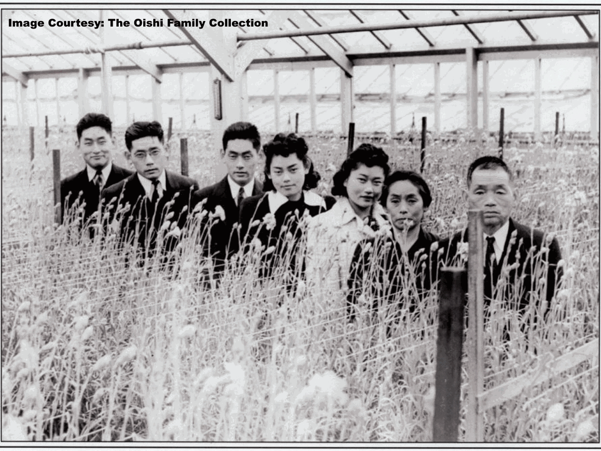 Flora Ninomiya: Imagine the land directly south to you filled with the translucent glass panes of dozens of wooden greenhouses painted in white. It was here that the Sakai nursery started in 1906 with an initial 2.5 acres in a single greenhouse salvaged from Berkeley. The nearby Oishi nursery started shortly after. These greenhouses specialized in cultivating cut flowers for the rapidly growing Flower Mart of San Francisco, where the roses made their way throughout the Bay and beyond. The nursery business was specially suited to the Issei (Japanese-born) Americans and the Nisei (the Japanese American children of immigrants), and it allowed these families to prosper in an era when anti-Asian racism was common. Both the Sakai and Oishi nurseries shut down in 1942 during the World War II relocation of Japanese. Many Japanese internees imprisoned by the U.S. government during the War returned to find their property sold or vandalized, but these nurseries survived without damage, and the families resumed operations when they returned after the war. Until the mid-2000s the nurseries were still owned and operated by the founding families. The City of Richmond acquired them, and has now built affordable housing for seniors on the site, known as Miraflores.
